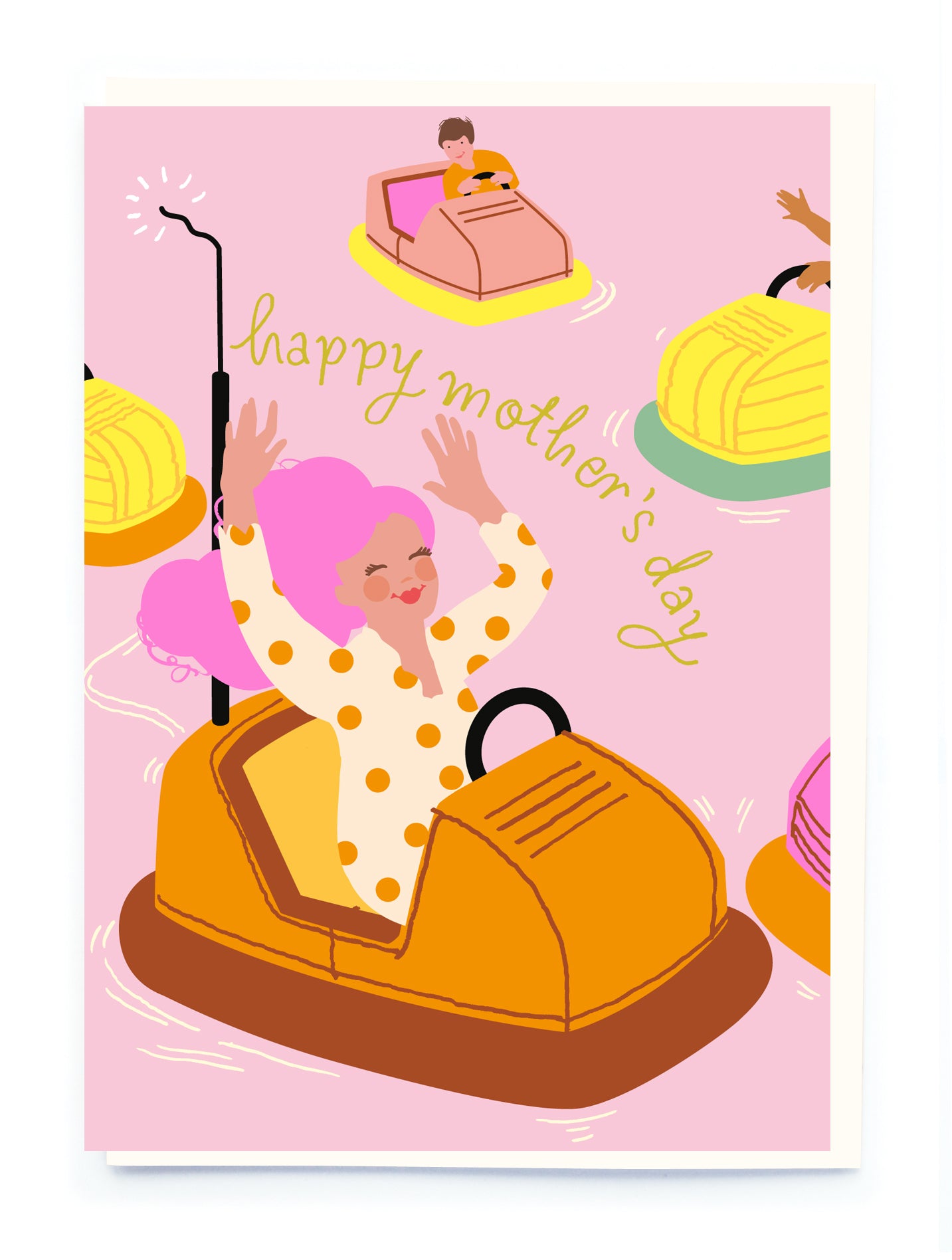 Bumper cars. "happy mother's day" gold foil message. Blank inside and supplied with an off white envelope. Designed and printed in the UK.