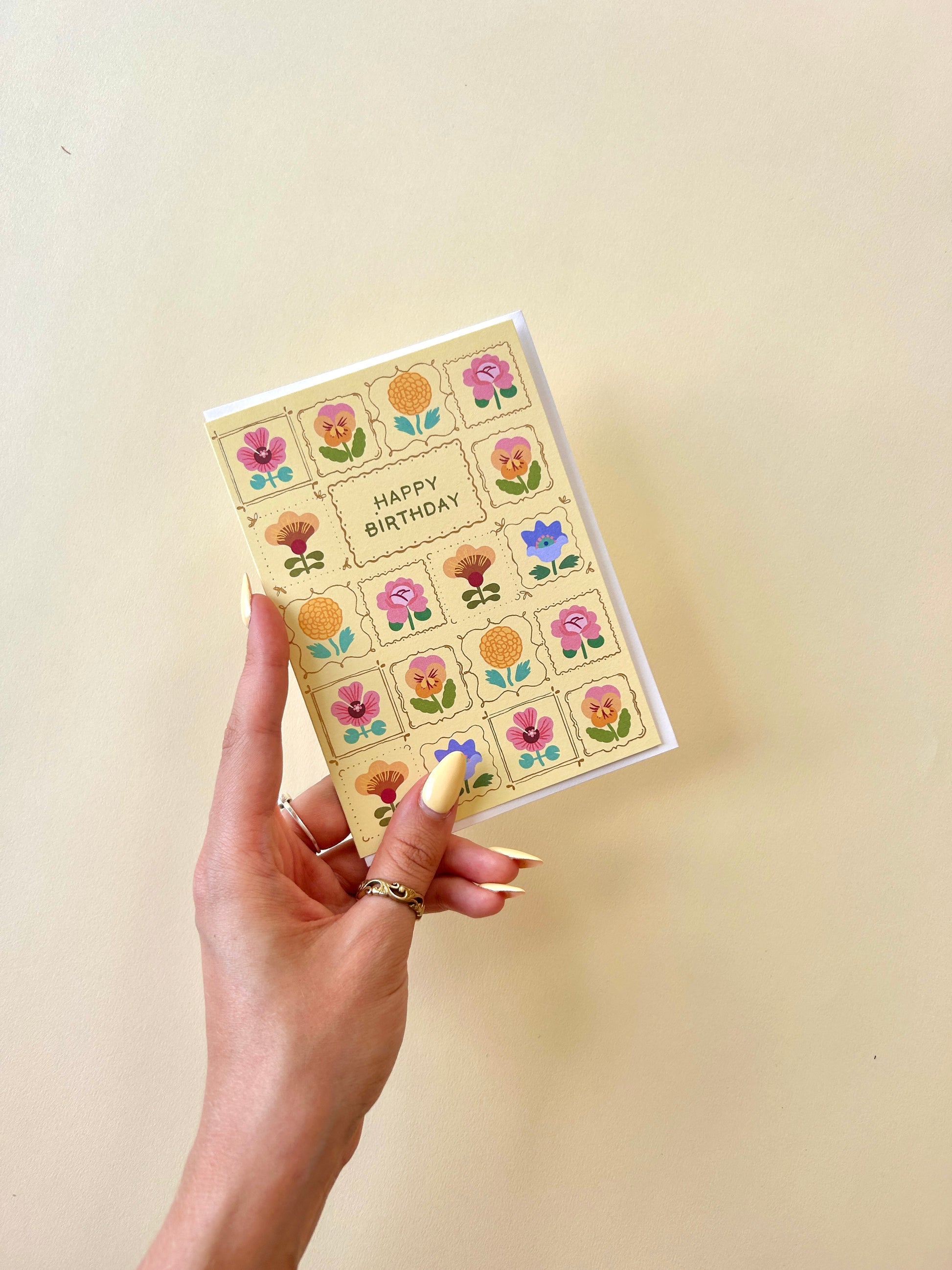 A joyful birthday card filled with cheerful blooms, arranged like a patchwork garden. Perfect for cottagecore flower lovers or anyone who brings colour wherever they go. Ideal for summer birthdays, thank-yous or sunny wishes across the sea.