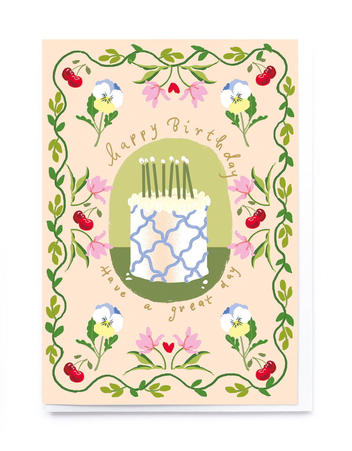 A slice of birthday joy! This charming card features a beautiful iced cake topped with candles, framed by dainty flowers and cherries.