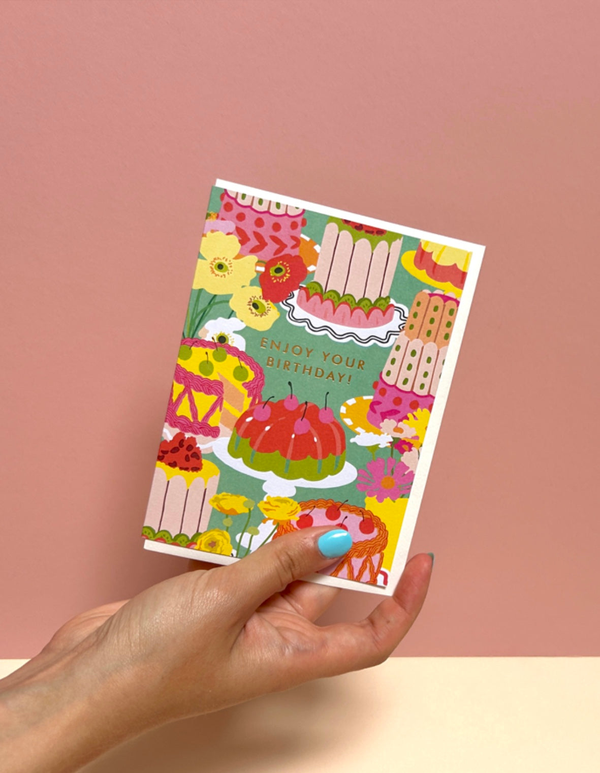 Featuring a delightful array of colourful cakes and jellies, this design is a feast for the eyes. The "Enjoy Your Birthday" message in gold foil adds a touch of sparkle to the illustration.