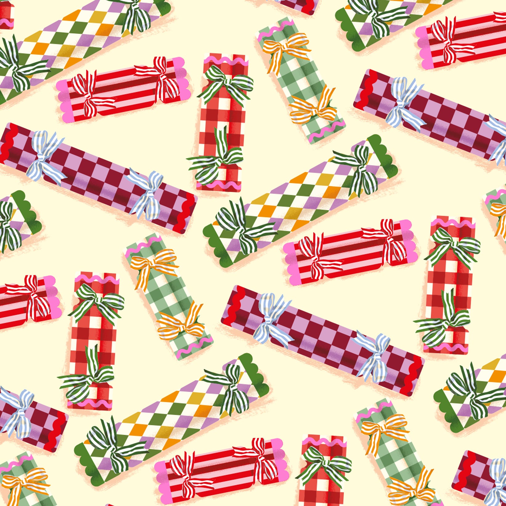 A wrapping paper that’s here to party. This bold design is packed with colourful gingham crackers in candy-cane shades, tied up with cheerful bows. It’s giving retro fun, festive sparkle, and a little bit of Christmas mischief, perfect for presents that’ll pop under the tree.