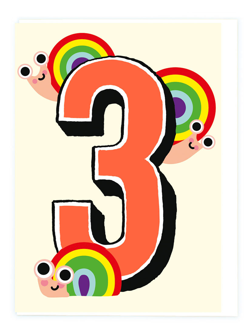 Colourful snails with a big neon orange foil number 3. Blank inside and supplied with a white envelope. Designed and printed in the UK.