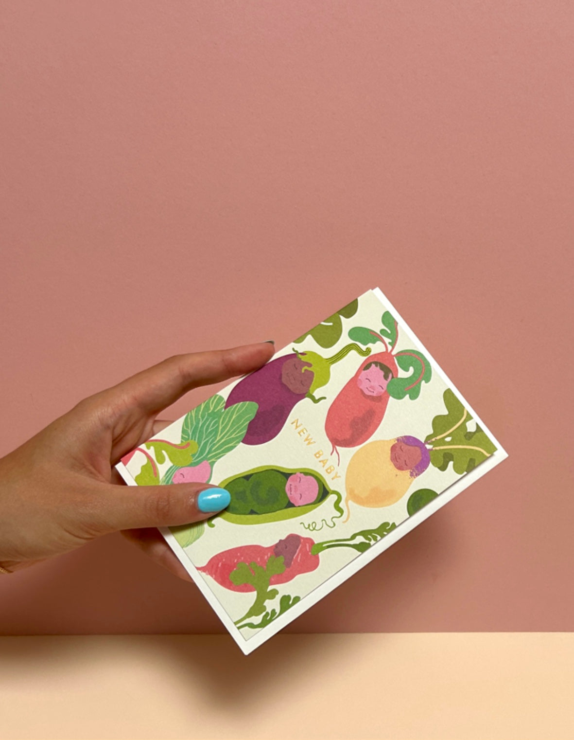 Featuring adorable babies nestled within vibrant vegetables, this whimsical design exudes warmth and delight. The "New Baby" message in elegant gold foil adds a touch of charm to this unique card.
