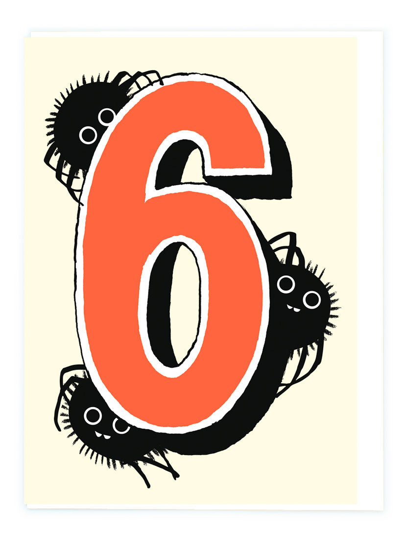 Spiders with a big neon orange foil number 6. Blank inside and supplied with a white envelope. Designed and printed in the UK.