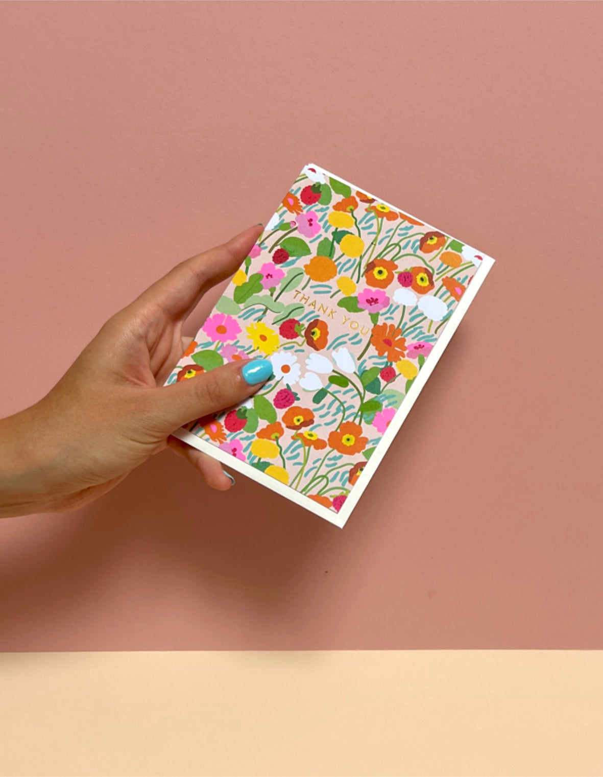 Featuring a vibrant, cheerful array of blooming flowers, this design is bursting with colour and joy. The "Thank You" message in elegant gold foil stands out amid the lively floral pattern, making it a delightful way to convey your appreciation.